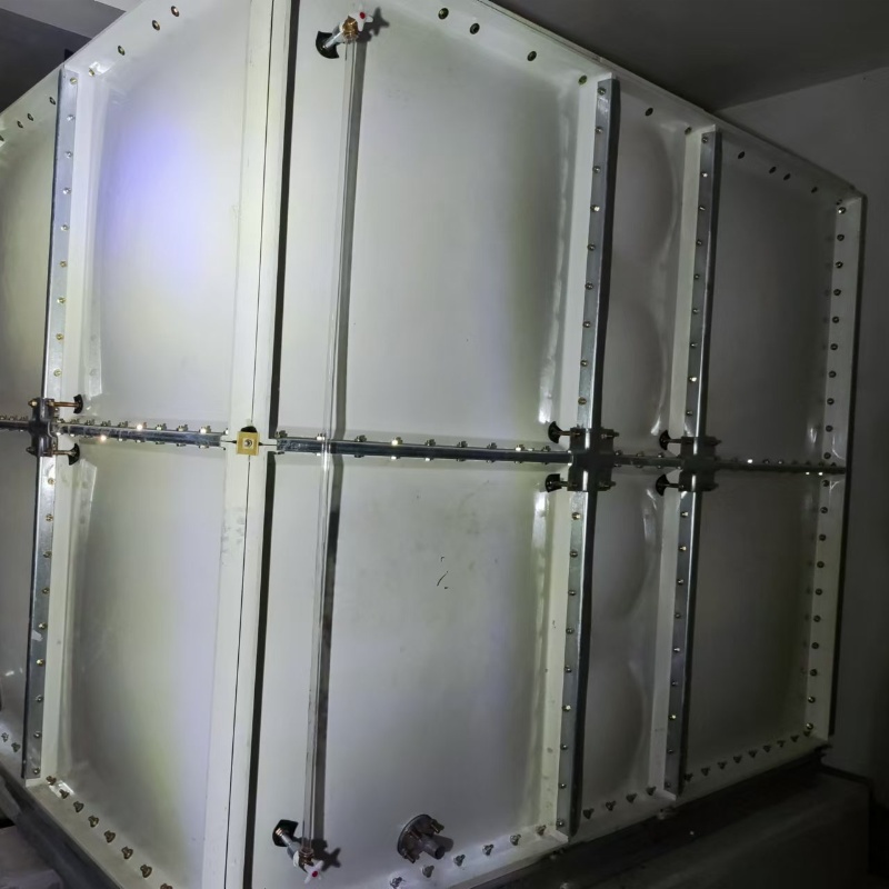 SMC水箱組裝就是用模壓的小塊,到施工現場組裝成大的水箱。外面要用角鋼進行固定的,角鋼搭出個水箱模型,在上面鋪玻璃鋼平板,拼縫處再現場多糊幾層方格布...